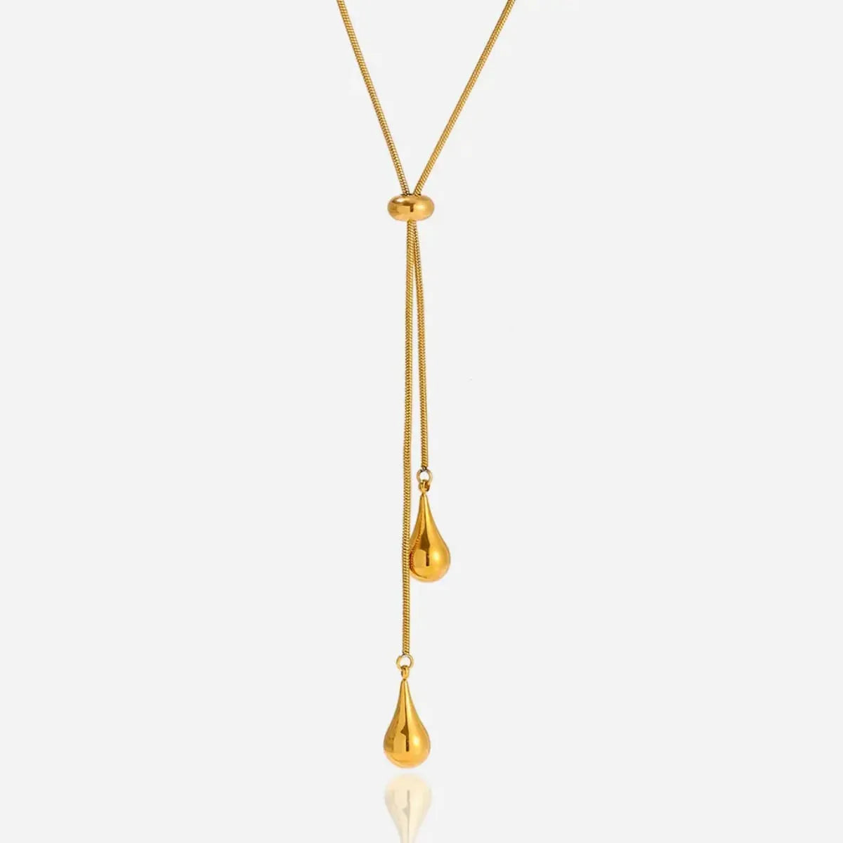 The AUREA DROP LARIAT by PRAVIORA is where luxury meets everyday elegance. Crafted in titanium steel with real 18K gold PVD plating (2.5–5 microns thick), this waterproof, anti-tarnish and hypoallergenic necklace is designed to shine for years. The sleek adjustable slider and fluid drop detailing create a modern silhouette that transitions effortlessly from office chic to evening glam. Comes with a 1-year warranty and luxe gifting packaging.