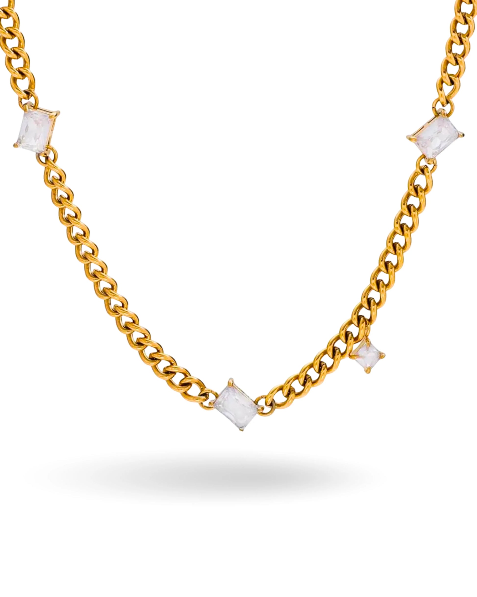 The RADIANT CHAIN NECKLACE WITH ZIRCON ACCENTS combines bold gold links with sparkling zircon stones for a modern, chic, and timeless look.